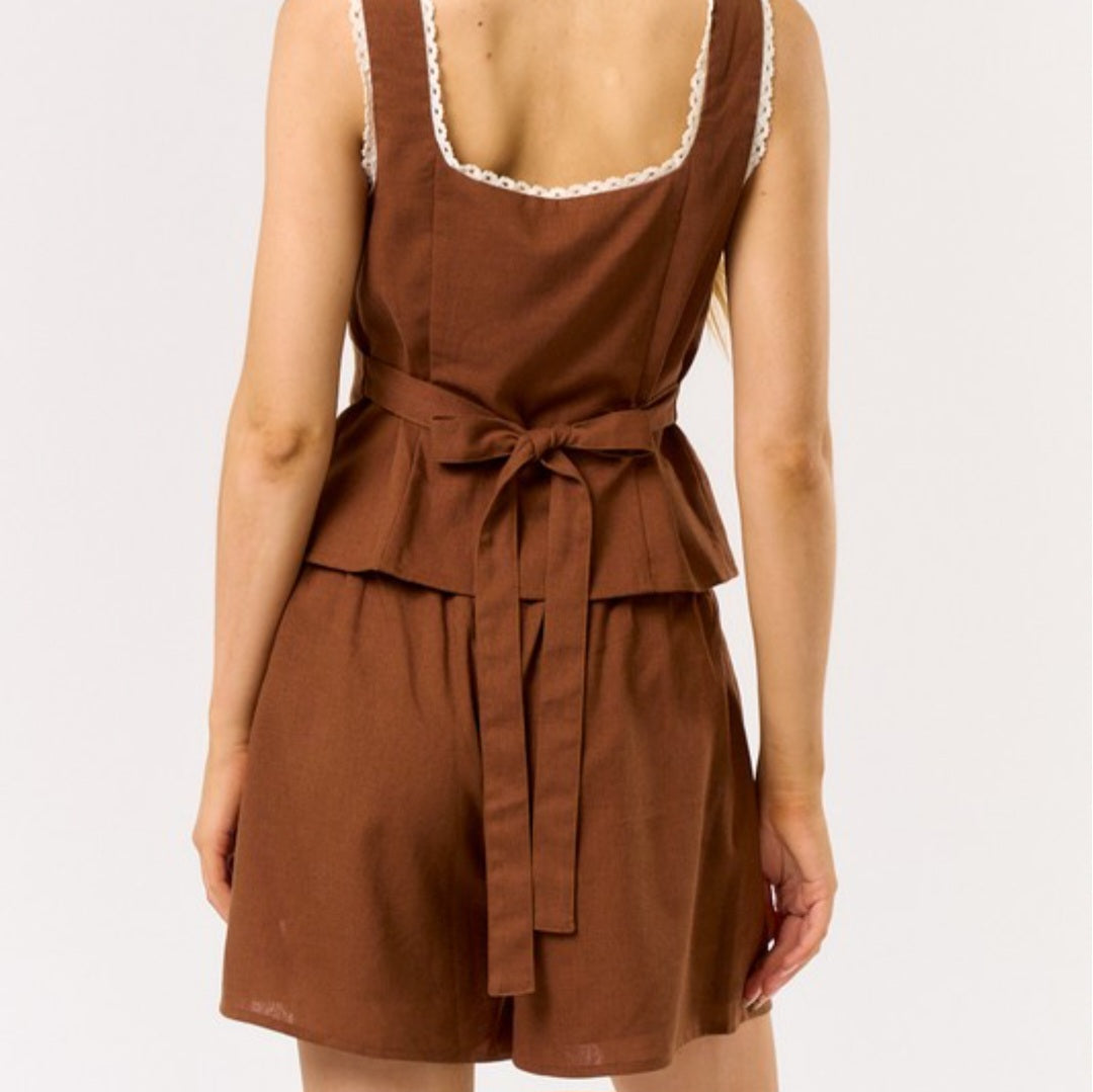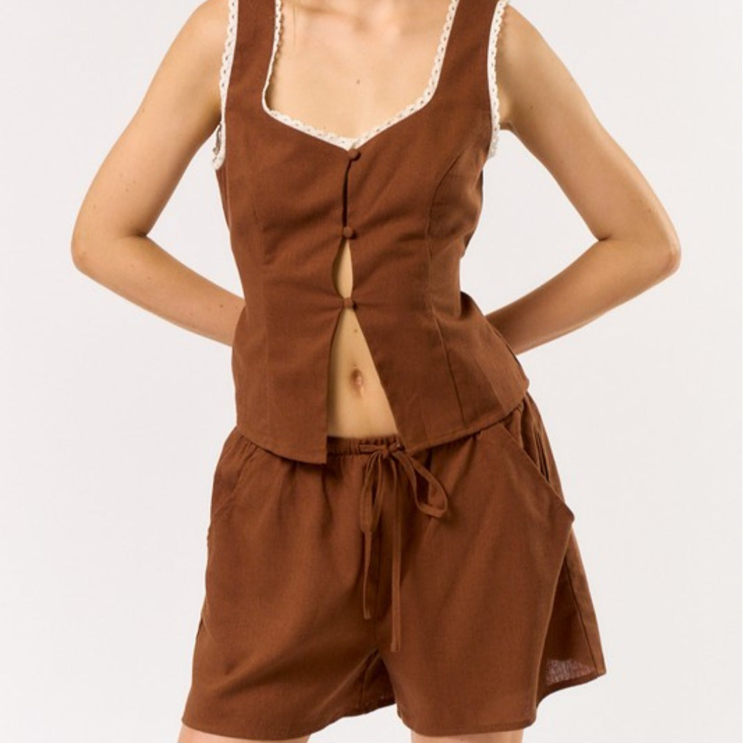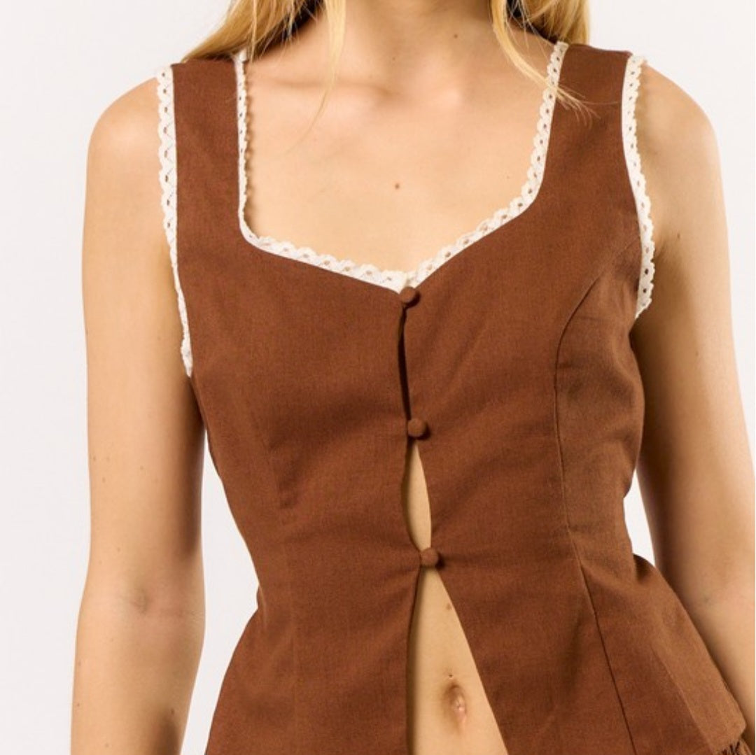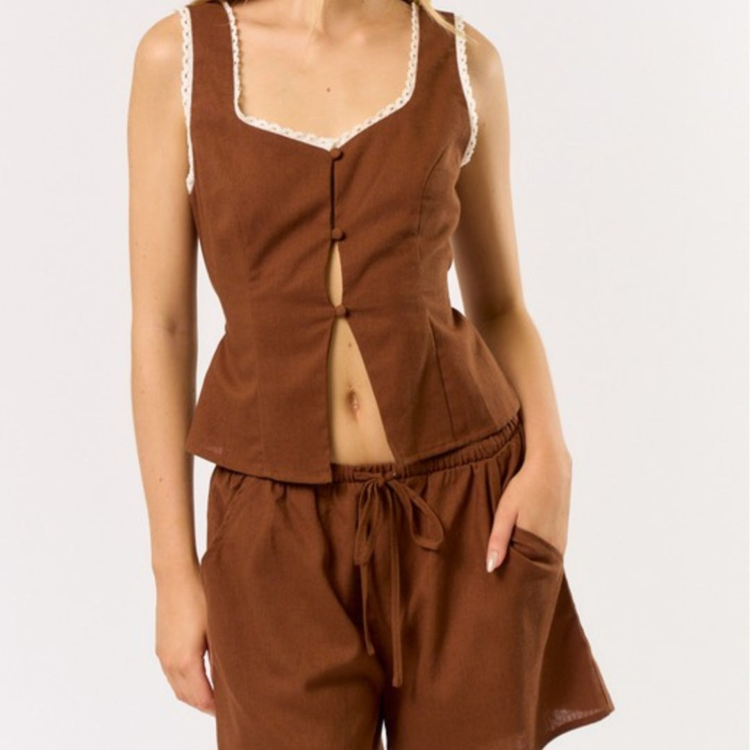 Top: Linen button down vest, lace edge, back tie detail, sweetheart neckline.