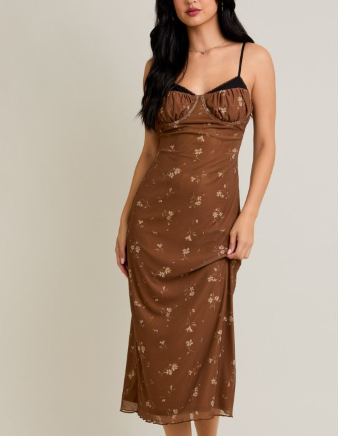 Mesh midi dress, adjustable spaghetti strap, ruched detail with under bra wire.
