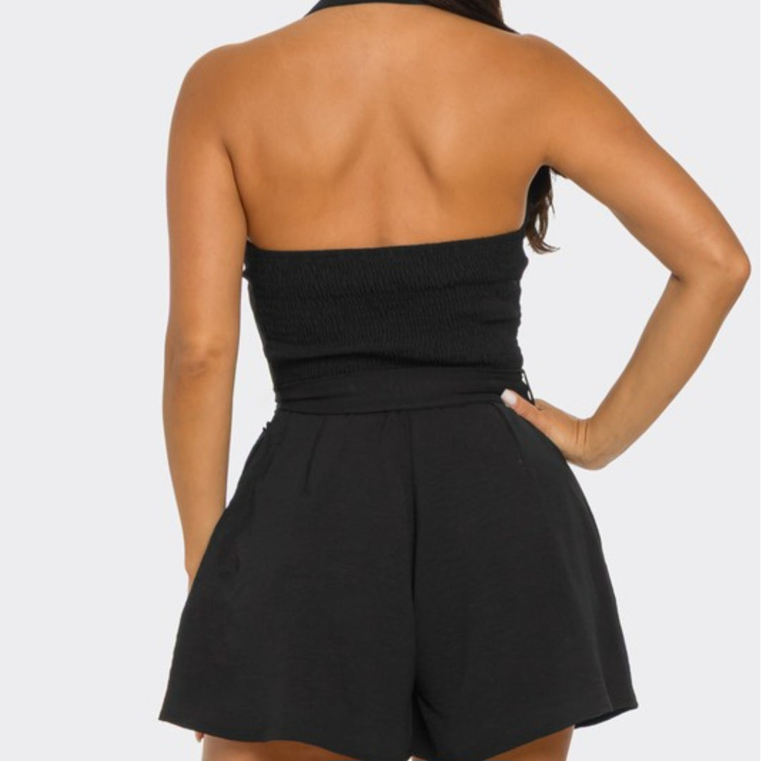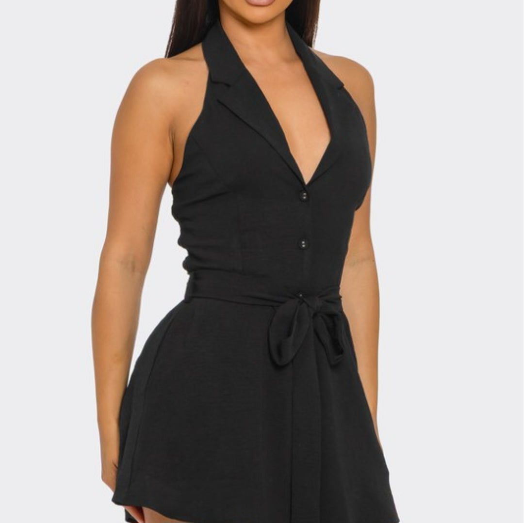 Black halter-top button down romper with belt.