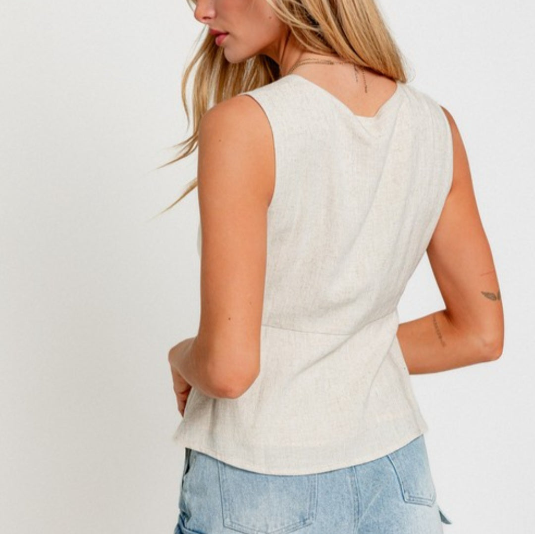 Sleeveless V-neck opened shirring top with adjustable front closure.