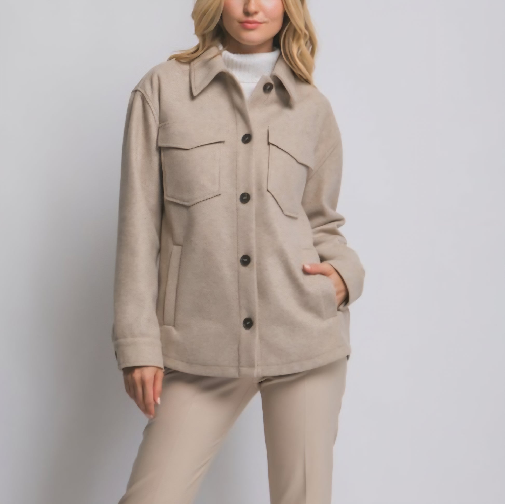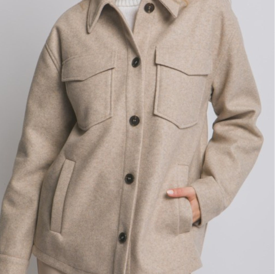 Button up fleece shacket with side pockets.