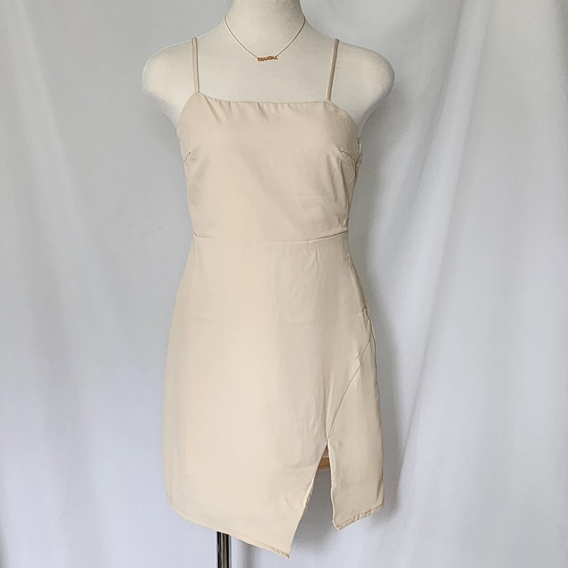 Features: sand color, woven, side zipper, square neck, adjustable straps, tie back, asymmetrical front hem.
