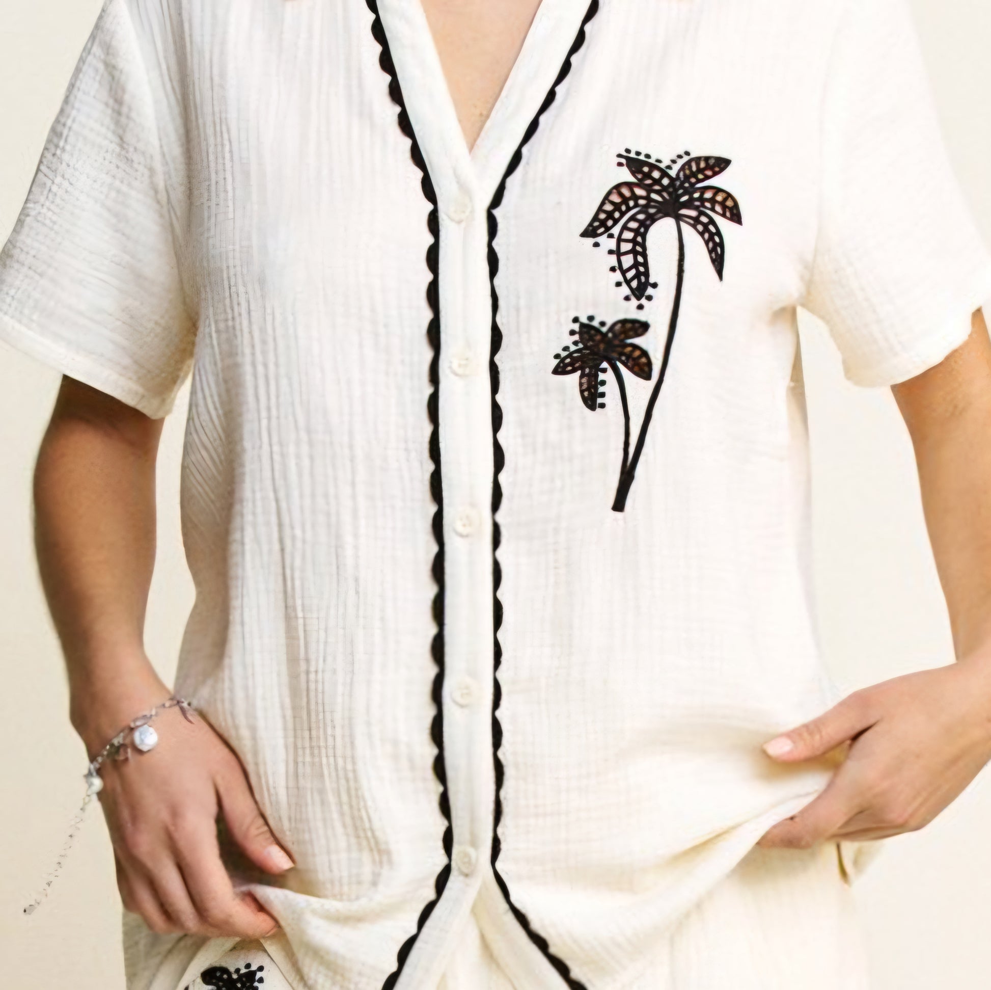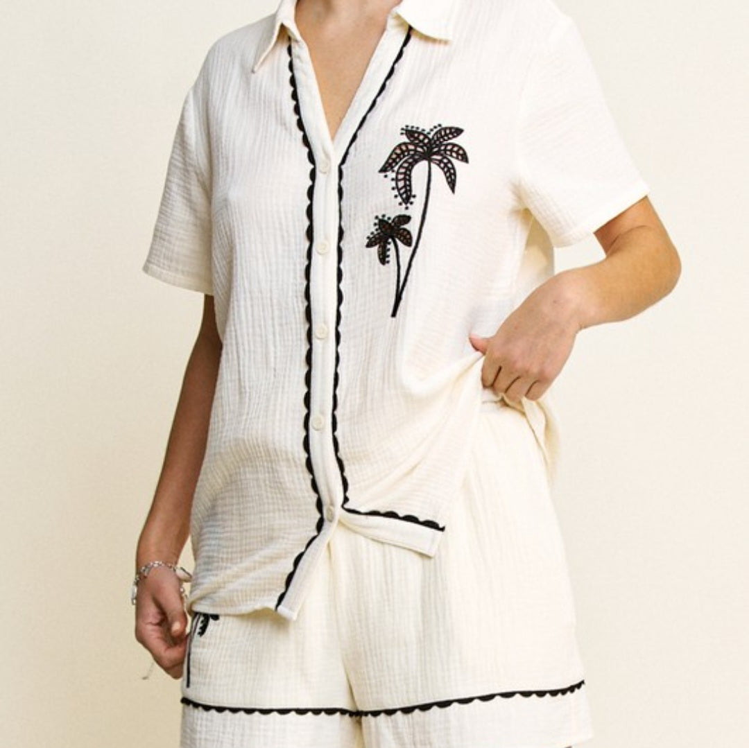 Cotton gauze, palm tree details/trim, button down shirt and shorts set.